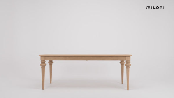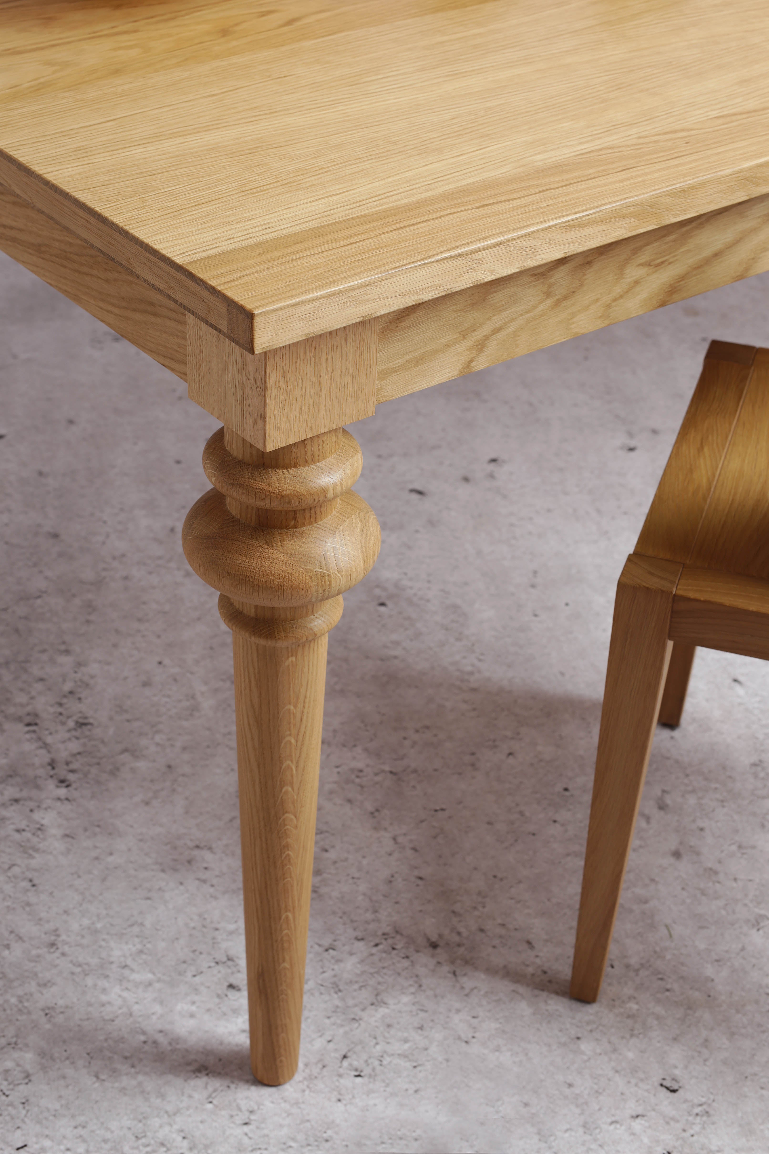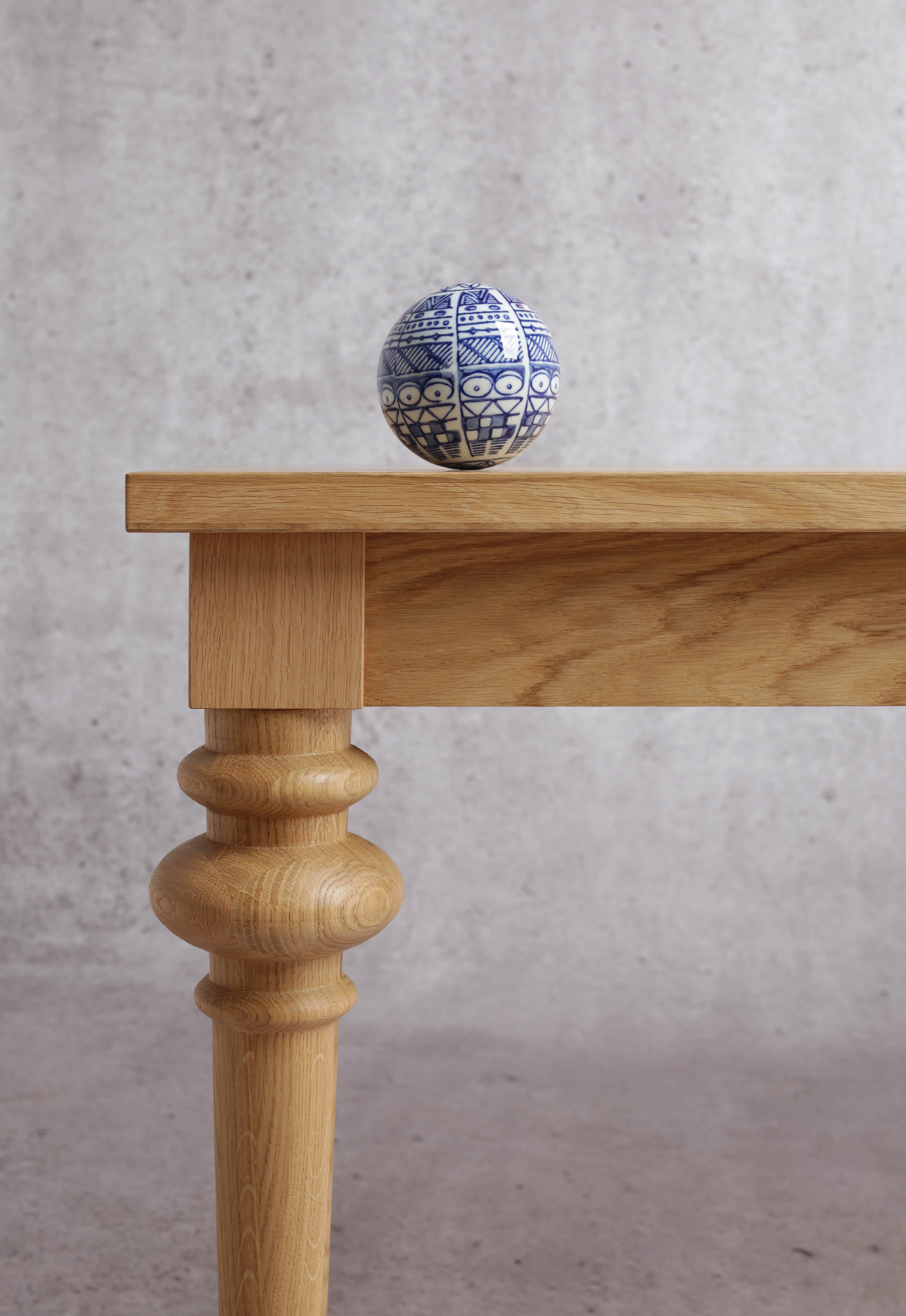 DECO to połączenie prostego w formie blatu z ozdobnie toczonymi nogami. Takie zestawienie nadaje meblowi klasyczną elegancję, podkreślając jednocześnie niepowtarzalne piękno drewna dębowego. W stole DECO każdy detal został dopracowany do perfekcji. Nie ma tu jednak przesadnych zdobień zakłócających czystość formy. Piękna bryła wyróżnia stół DECO wśród mebli z okrągłymi nogami.