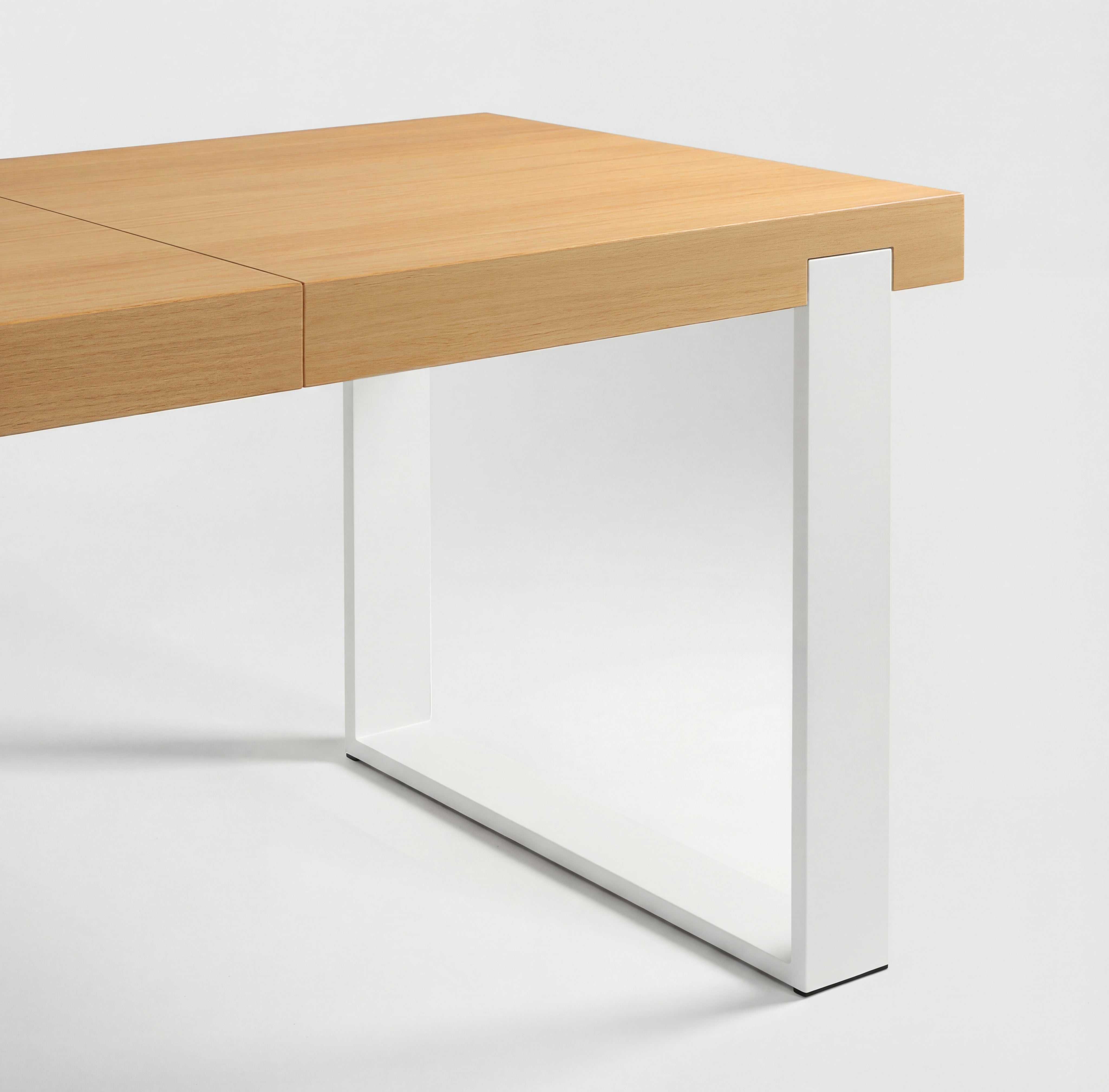 Solidna bryła została zamknięta w lekką wizualnie formę. Dębowy blat stołu płynnie łączy się z nogami w jednej płaszczyźnie, dzięki czemu stół FRAME doskonale prezentuje się z każdej strony. Nogi w tym modelu mogą być wykonane z lakierowanego aluminium lub szczotkowanej stali nierdzewnej. Istnieje też możliwość zamówienia nóg w dowolnym kolorze z palety RAL.