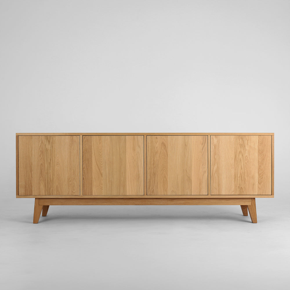 Całość mebla wykonana jest w 100% z drewna dębowego w jakości SELEKT. Dla zachowania sztywności drzwiczki klejone są trójwarstwowo z lameli dębowych. Plecy mebli wykonane są z lameli dębowych wpuszczanych w korpus, tak aby połączenia były niewidoczne. Takie rozwiązanie sprawia, że mebel prezentuje się estetycznie również od tyłu. Szuflady i półki także wykonane są w całości z drewna dębowego.