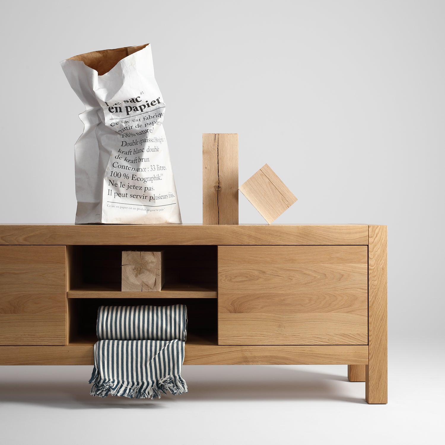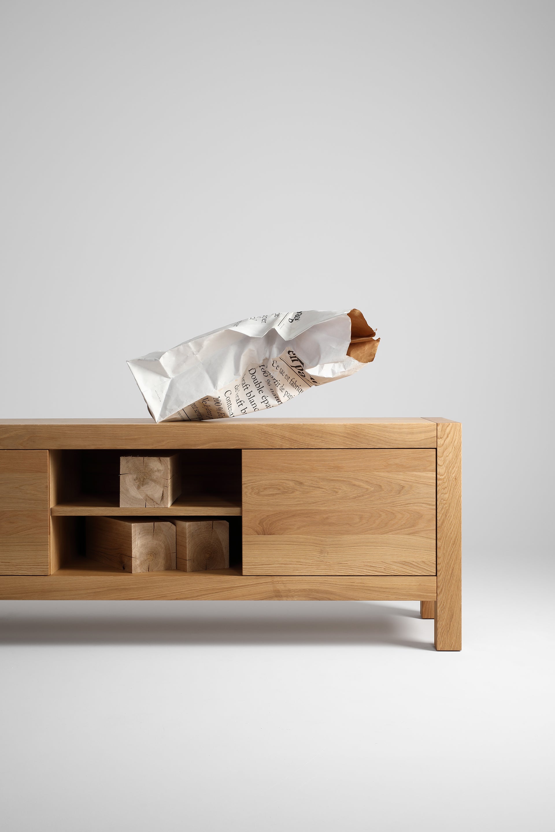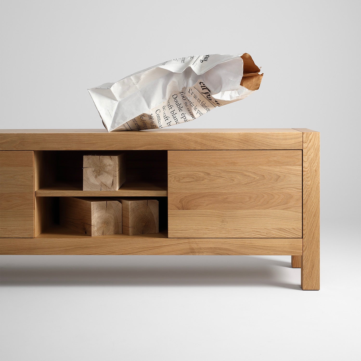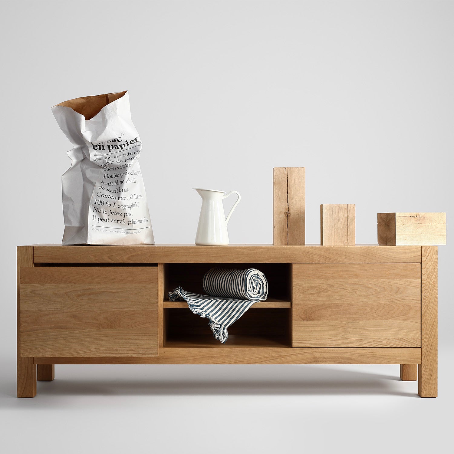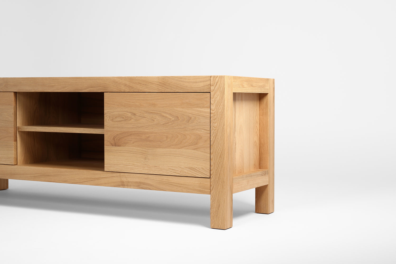 Całość mebla wykonana jest w 100% z drewna dębowego w jakości SELEKT. Dla zachowania sztywności drzwiczki klejone są trójwarstwowo z lameli dębowych. Plecy mebli wykonane są z lameli dębowych wpuszczanych w korpus, tak aby połączenia były niewidoczne. Takie rozwiązanie sprawia, że mebel prezentuje się estetycznie również od tyłu. Szuflady i półki także wykonane są w całości z drewna dębowego.