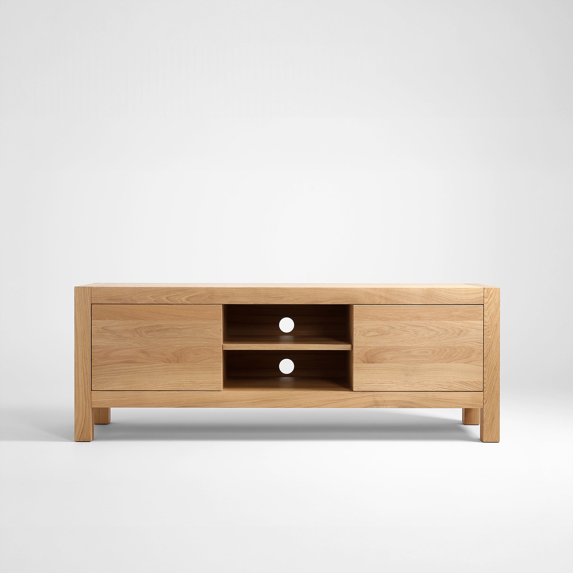 Szafka RTV z kolekcji BLOX doskonale pasuje do stolika kawowego, komody oraz krzeseł z tej serii. Szafka wzbogaci salon o funkcjonalny mebel do ekspozycji sprzętu audio lub video. W dwóch pojemnych szufladach można umieścić prywatną kolekcję płyt CD, tak by zawsze była blisko odtwarzacza położonego w centralnej części szafki. Szuflady pomogą też ukryć drobny sprzęt czy zapasowe kable. Na indywidualne zamówienie możemy zmodyfikować gabaryty szafki i zmienić umiejscowienie przepustów kablowych.