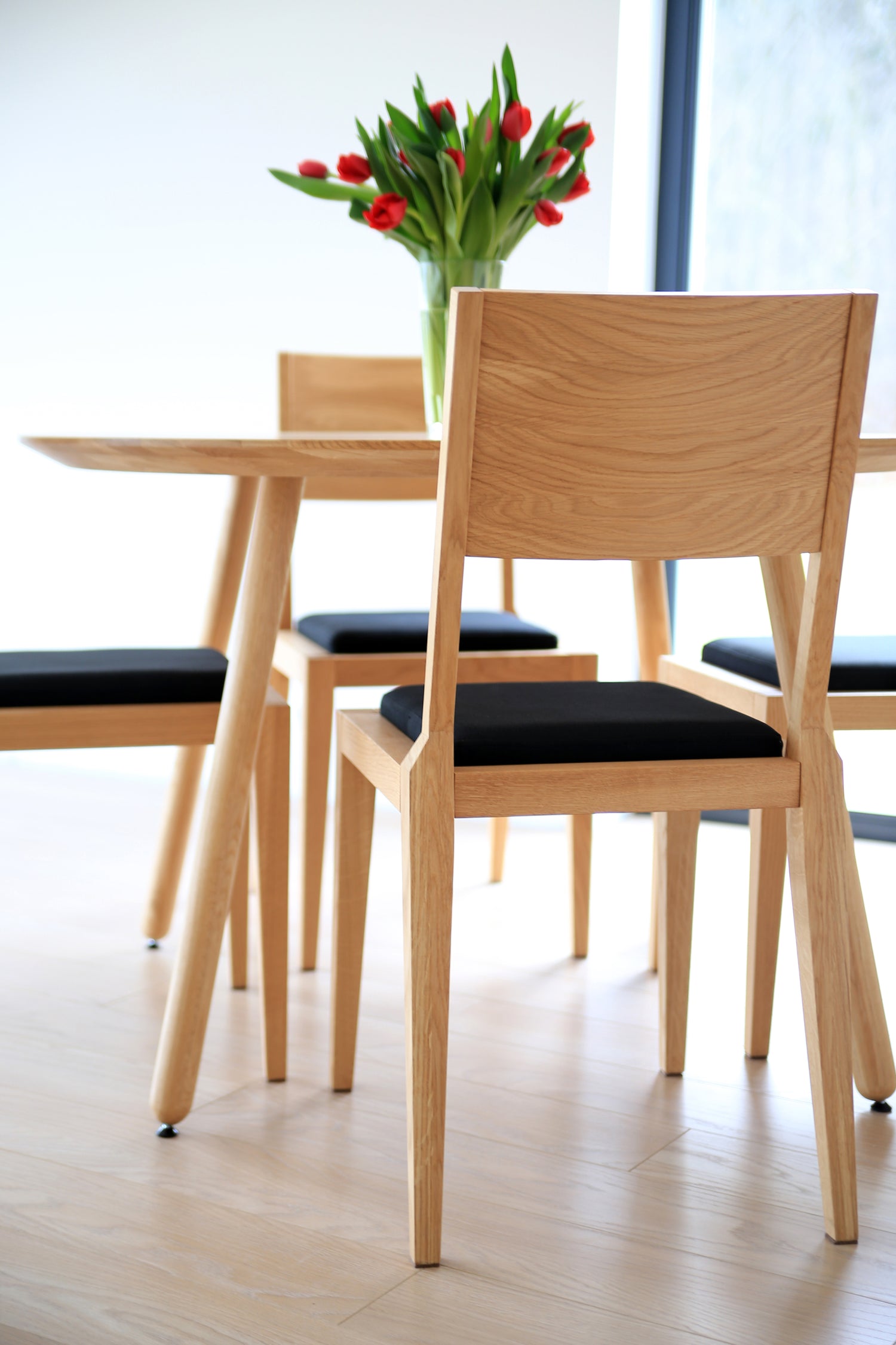 Konstrukcja krzeseł wykonana jest z selekcjonowanego drewna dębowego. Siedzisko oraz oparcie wykonane są z klejonki warstwowej z lameli dębowych. W wersji tapicerowanej konstrukcja oparta na ramce dębowej i pasach tapicerskich.