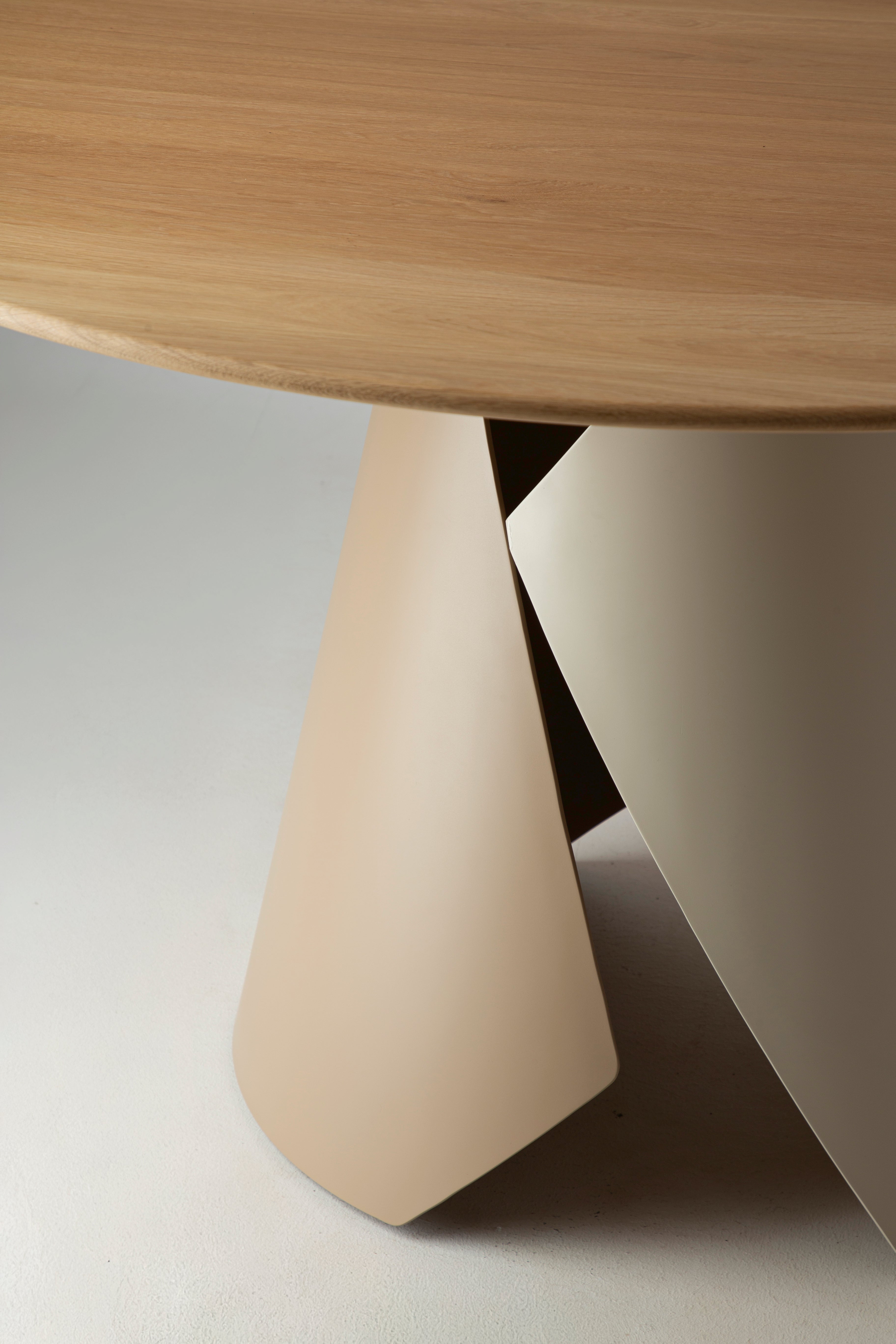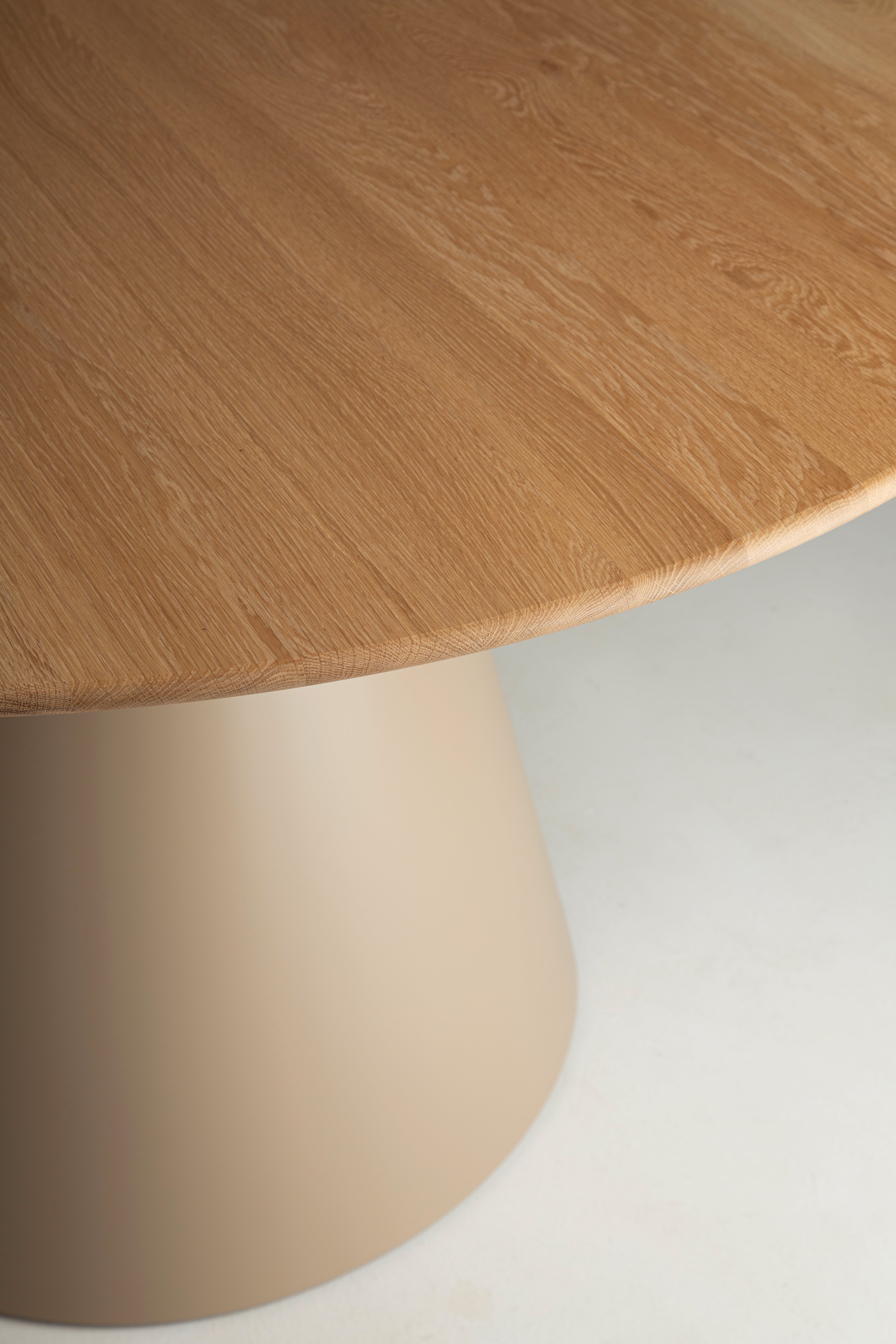 Blat stołu, o miękkim, organicznym kształcie, wykonany jest z najwyższej jakości drewna dębowego. Jego powierzchnia została starannie wykończona olejowoskami, które podkreślają naturalną strukturę i usłojenie drewna, jednocześnie zapewniając mu dodatkową ochronę.