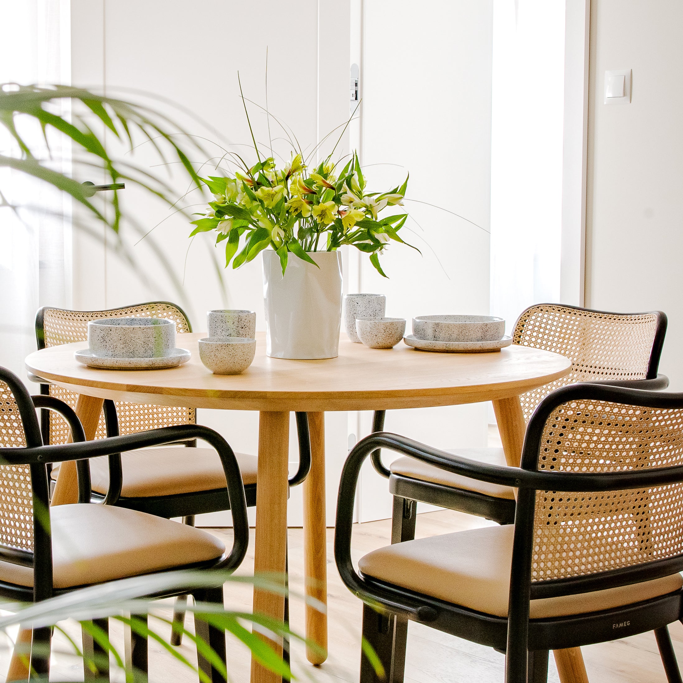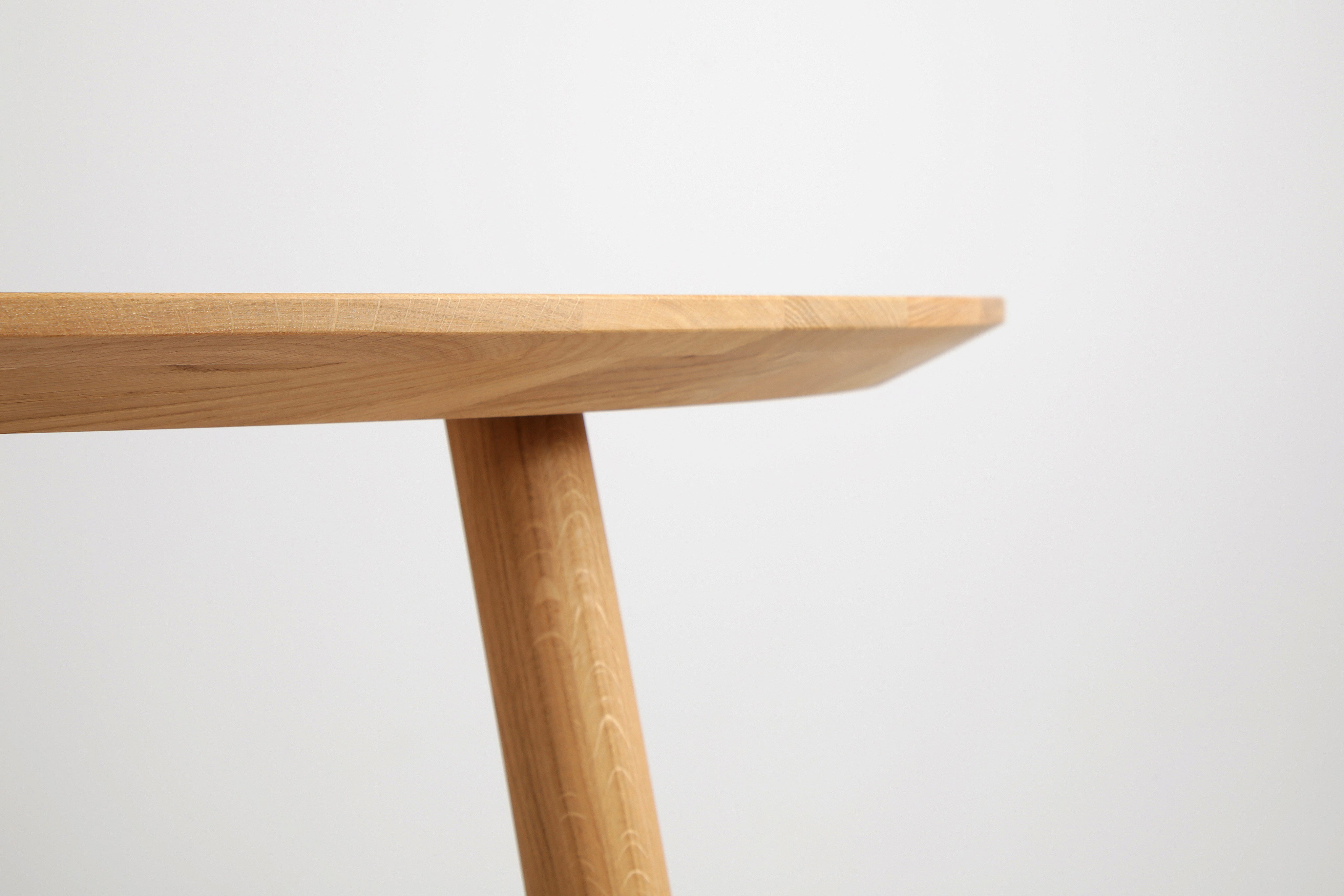 Stół okrągły OX z naturalnego drewna dębowego wyróżnia się wyjątkowo ciekawą formą. Jego lekki wygląd uzyskaliśmy dzięki połączeniu blatu z czterema okrągłymi nogami. Podfrezowany blat stołu OX ma kształt dysku i sprawia wrażenie unoszącego się w przestrzeni, mimo że dobrze opiera się na rozstawionych pod niewielkim kątem nogach.